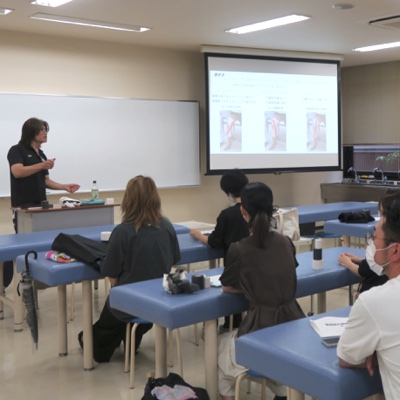 もう一方の会場では在校生や卒業生のみなさんにご参加いただき小笠原孝嗣先生、河嶌先生ご指導のもと「膝関節内側側副靭帯損傷」の広範囲のテーピングにトライしました。